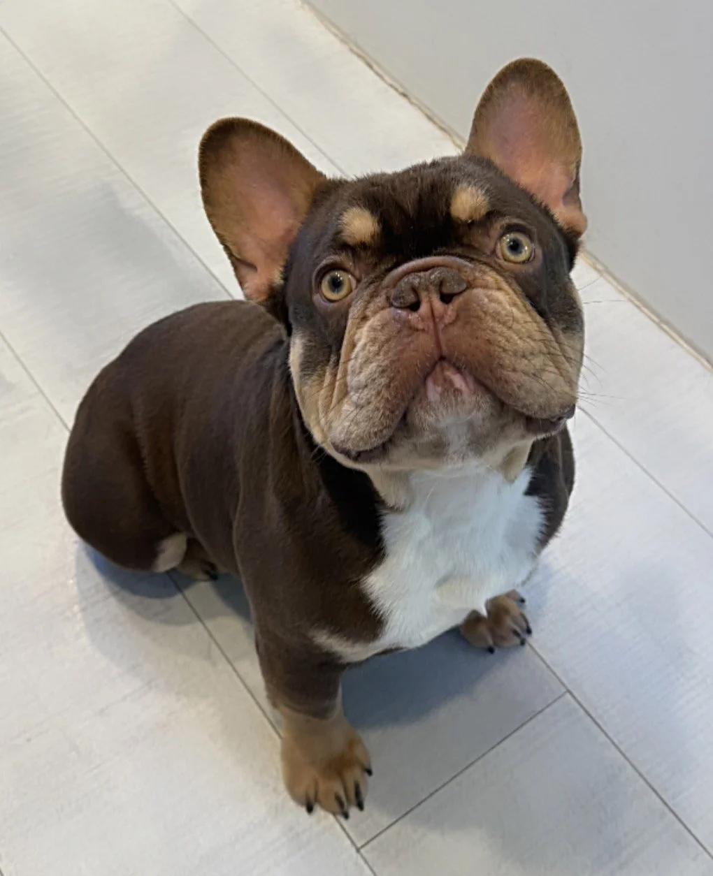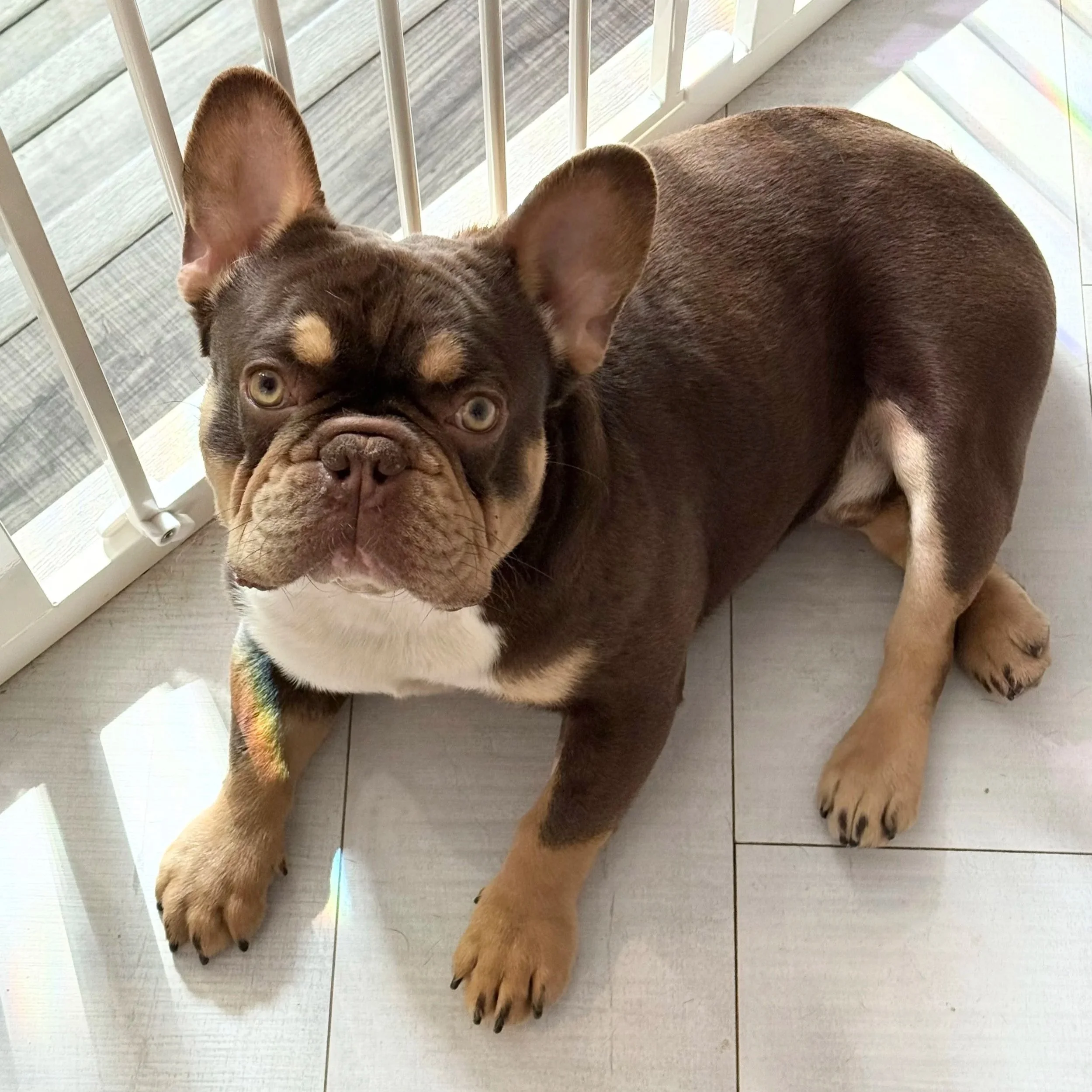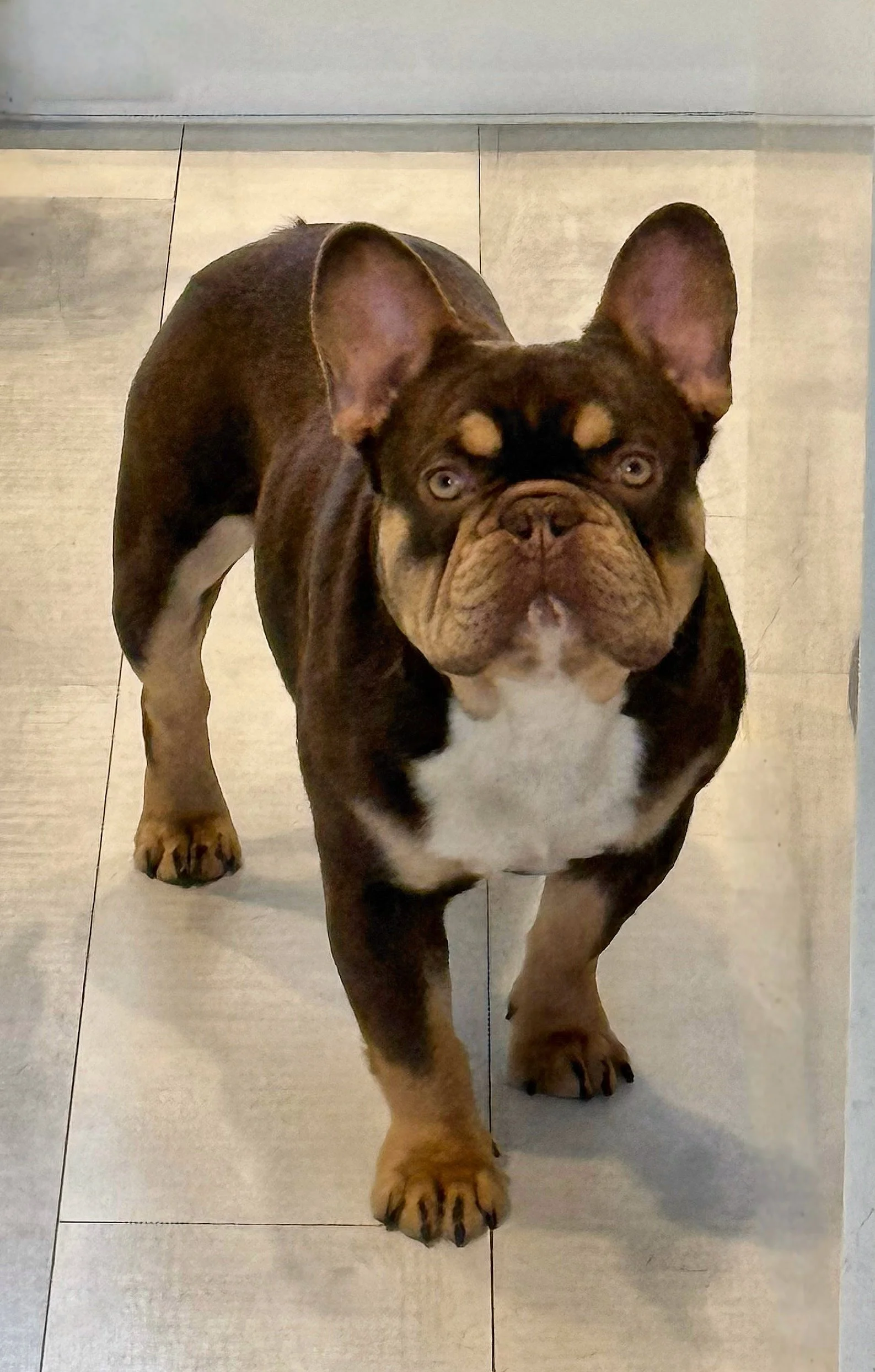 Born here at Free to Fly Frenchies, Mr. Chunk is my black and tan pied carrying fluffy. He was named in only his first week of life as I knew from birth that this boy was going to be thick!
