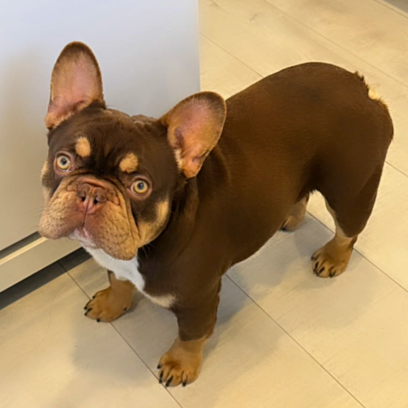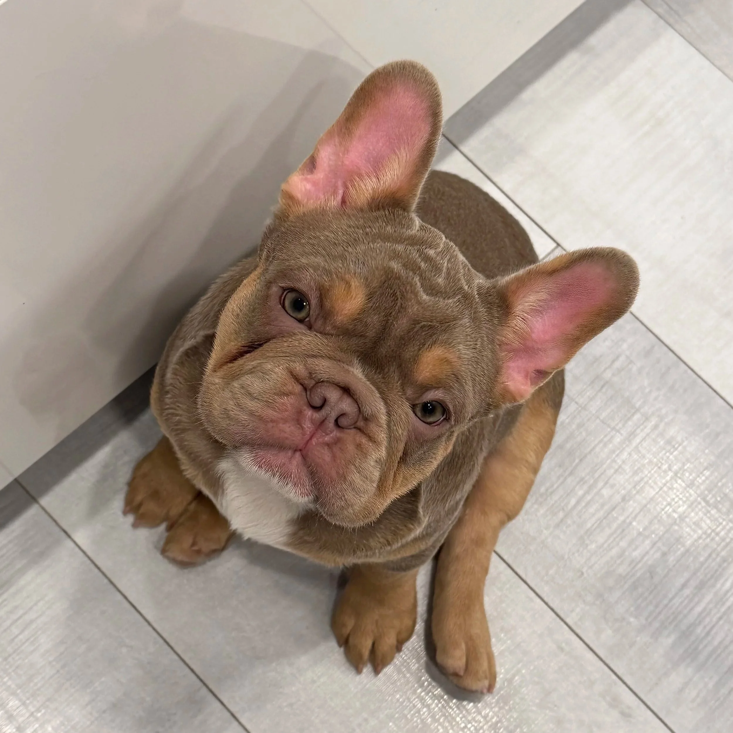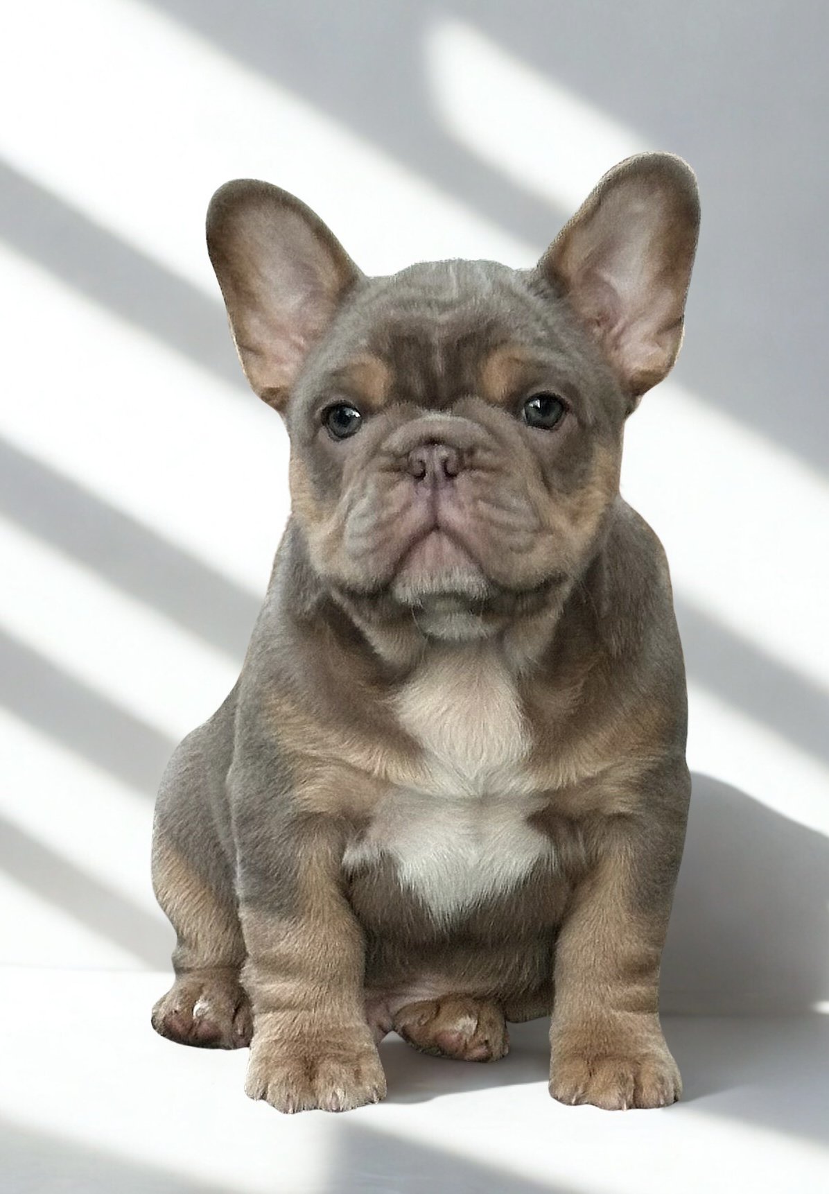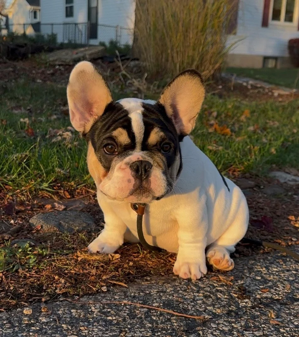 Born here at Free to Fly Frenchies, Mr. Chunk is my black and tan pied carrying fluffy. He was named in only his first week of life as I knew from birth that this boy was going to be thick!