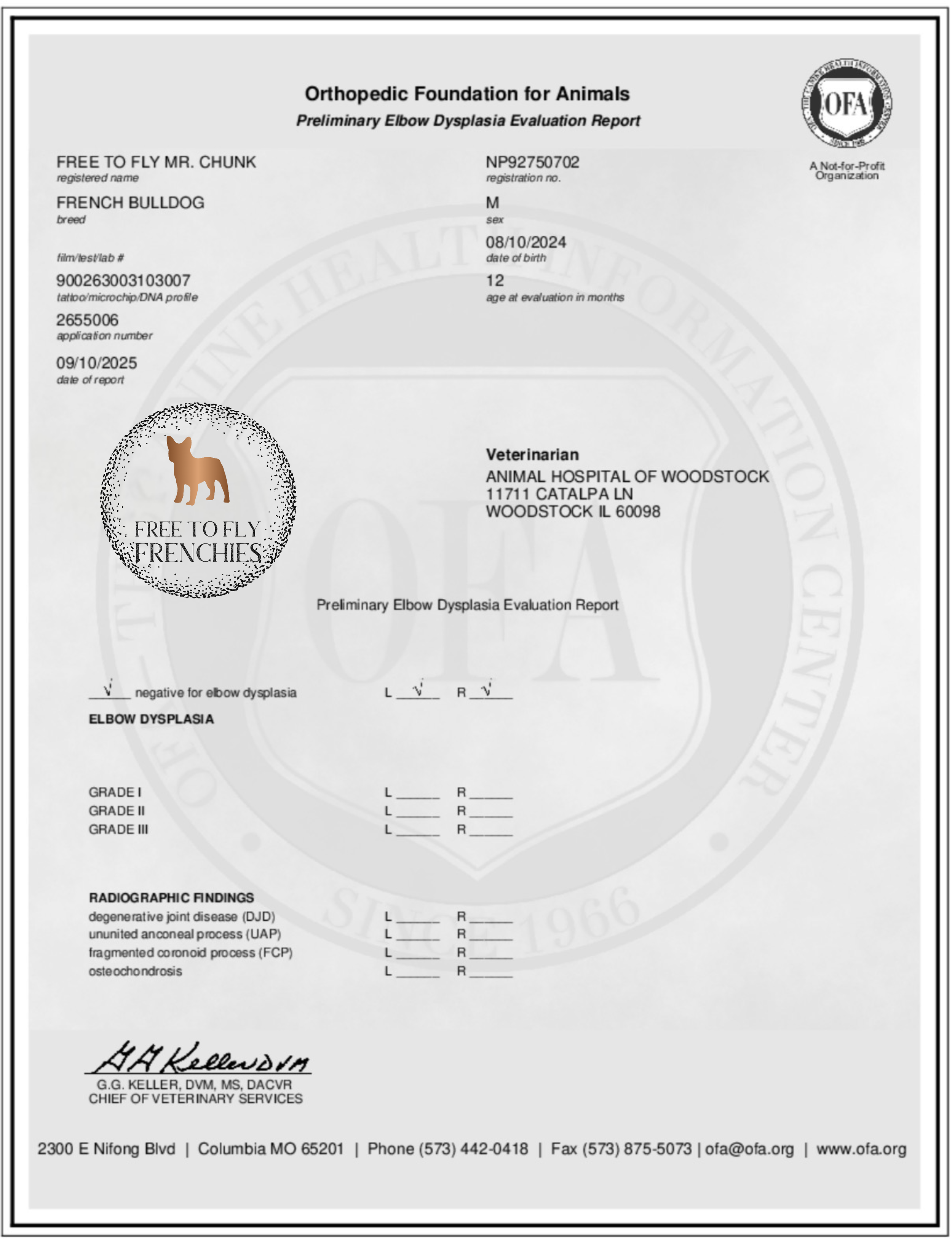 OFA completed along with a PennHip, where he scored among the lowest risk percentile for the breed.