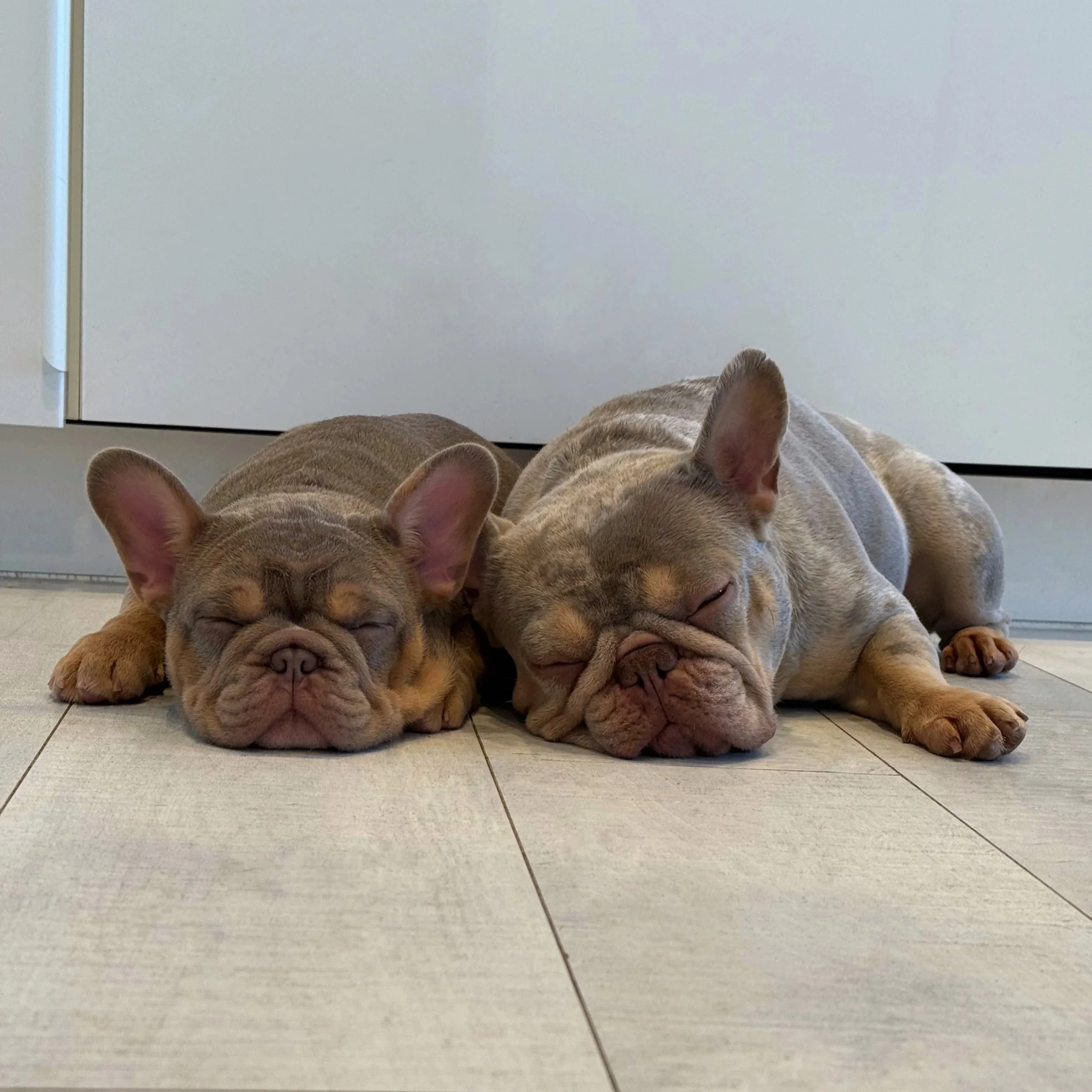 Griffin carries cream, pied, and fluffy. He is a rich honey Isabella and tan, with a darker base coat and cherry tan points - compared to Phoenix’s champagne coat and cream tan points.